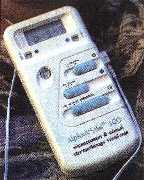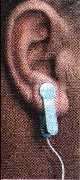 arthritis and a diabetic condition. Clips are attached to the ear lobes (left), and the unit (far right) provides a microcurrent that passes through the body and brain. The device can be obtained