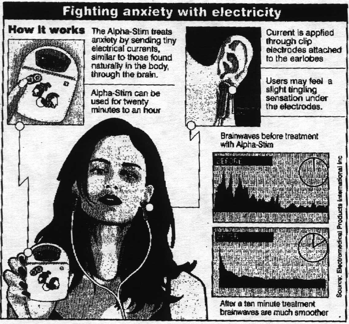 Published in YORKSHIRE POST, September 14, 1999: Is it a personal stereo? No Fear... this is science’s answer to high anxiety IT is compact, stylish and could be mistaken for a personal stereo, but this little box of tricks plays no music – instead it conquers fear. The Alpha-Stim sends a stream of electricity through the brain that re-tunes neurons wound up by stress and anxiety. In minutes it can take the terror out of nightmarish job interviews, nail-biting exams or stomach-churning visits to the dentist. It will also assist someone with a flying phobia to sit back and enjoy the flight, and alleviate depression and insomnia. Officially launched in Britain today, the £197 device is already licensed as a medical treatment by the US Food and Drug Administration. In clinical trials it has produced at least a 25 per cent improvement in up to 80 to 90 per cent of patients suffering from anxiety. The Alpha-Stim is described as a “cranial electrotherapy stimulator”. Housed in a slim blue and white plastic container small enough to fit in the hand, it has two electrodes that clip on to the earlobes. There are two settings which will leave it switched on for 20 minutes or an hour. The effects last for between three and eight hours, but are cumulative, so over time it can be used less frequently. Nick O’Hare, managing director of the London-based medical equipment company Osbon Medical, which distributes the Alpha-Stim in Britain, thought the device could become a fashionable lifestyle accessory for stress-charged urban living. “At first glance it looks just like a personal stereo,” he said. “You can slip it in your handbag or clip it on to a belt. It’s not necessarily meant for people with extreme problems, although it will help them too. It’s for anybody or everybody who wants to feel less of a stress victim. “You can put it on at breakfast every day before going to work, or whenever you need it. The effect is hard to describe – you feel sort of light headed and ‘cleaner’. “It gives you clarity and makes your thoughts more organised.” Mr. O’Hare said he used the Alpha-Stim to overcome claustrophobic panic attacks while traveling on the London Tube. His wife uses it to overcome fear of flying. The device has been developed from a prototype designed 17 years ago by American neurobiologist Dr. Daniel Kirsch that was the size of a suitcase. At present it is only available by mail order in Britain.